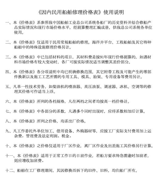 《因内民用船舶修理价格表》使用说明