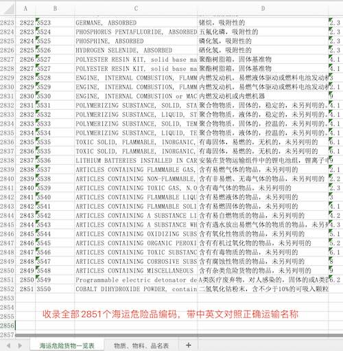 包含国际海运危险货物规则第二卷的危险品一览表全部列内容。