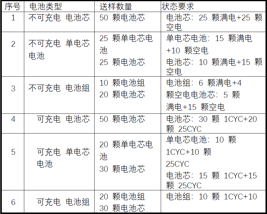 UN38.3测试送样首先要确认电池类型,不同类型电池的测试数量不同,对于小型电池如下:  点击查看大图